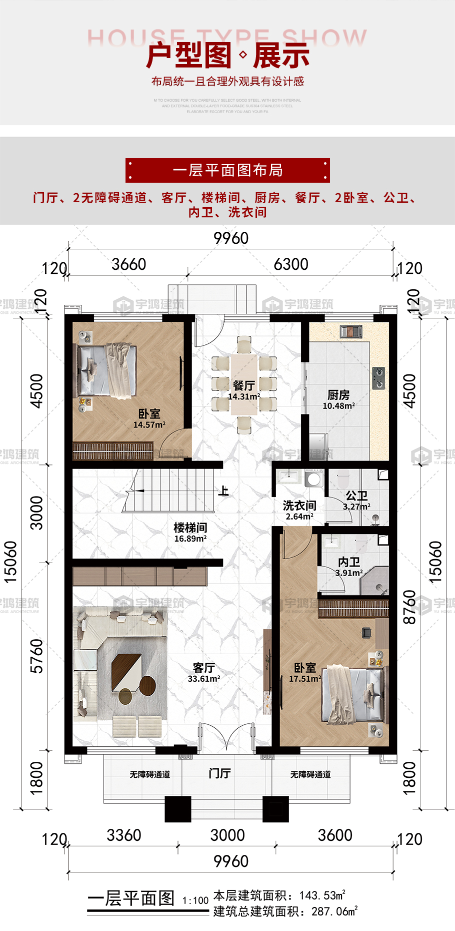 | 開間:9.96米 | 進深:15.06米 | 占地面積:143.53平方米 | 建筑面積:287.06平方米 |