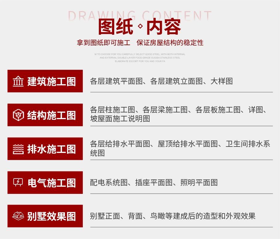 | 建筑圖: | 建筑平面圖:一層平面圖,二層平面圖; 建筑立面圖:東立面圖,西立面圖,南立面圖,北立面圖,剖面圖; 大樣圖:樓梯詳圖,細部大樣,門窗大樣 |