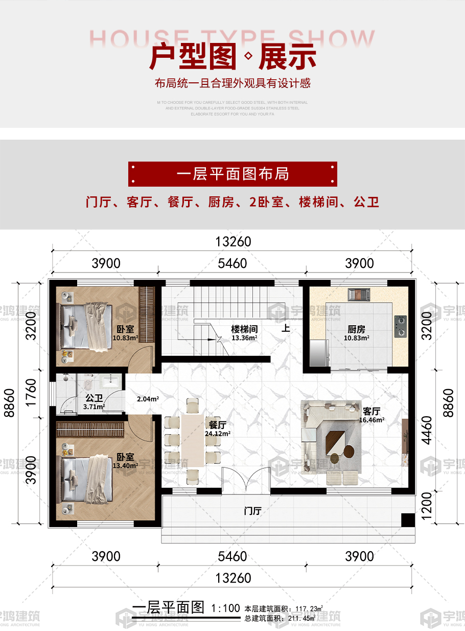 | 開間:13.26米 | 進深:8.86米 | 占地面積:122.85平方米 | 建筑面積:211.45平方米 |