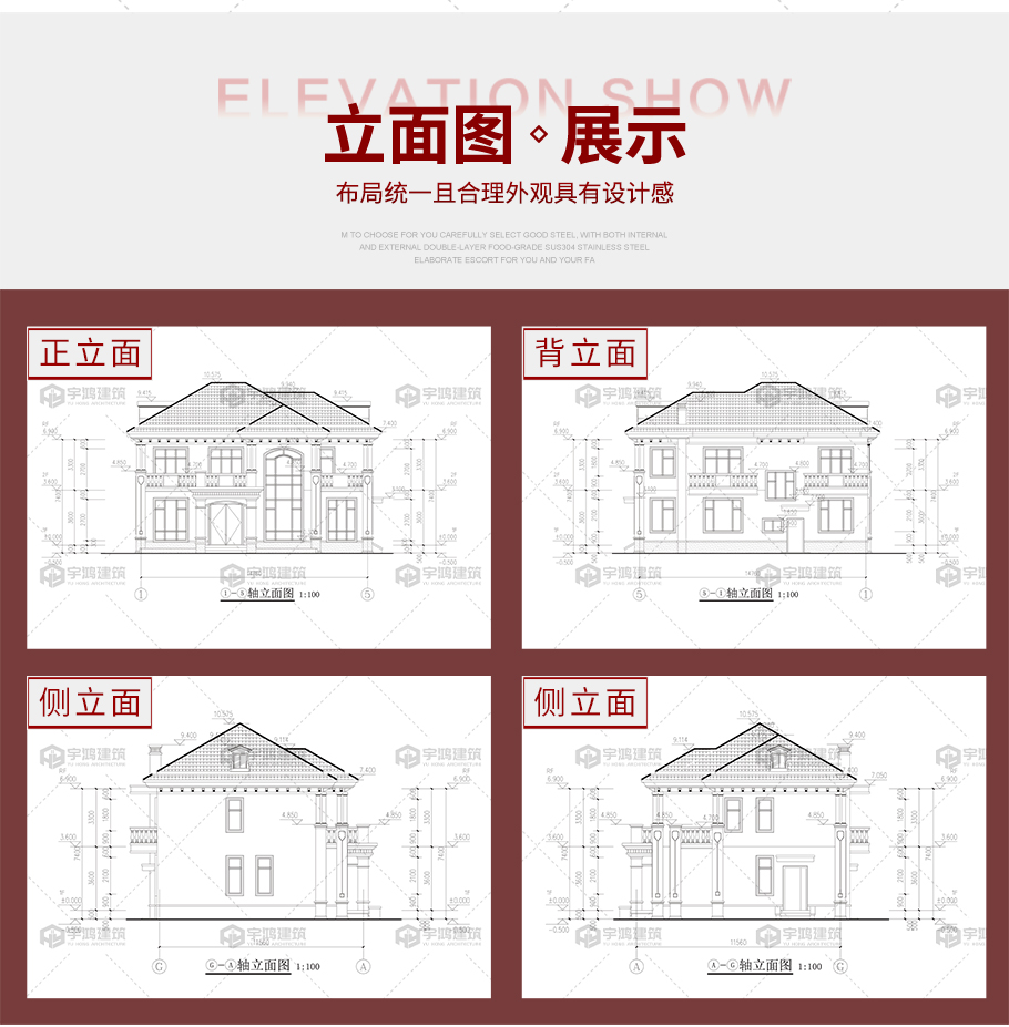 | 建筑圖: | 建筑平面圖:一層平面圖,二層平面圖; 建筑立面圖:東立面圖,西立面圖,南立面圖,北立面圖,剖面圖; 大樣圖:樓梯詳圖,細部大樣,門窗大樣 |