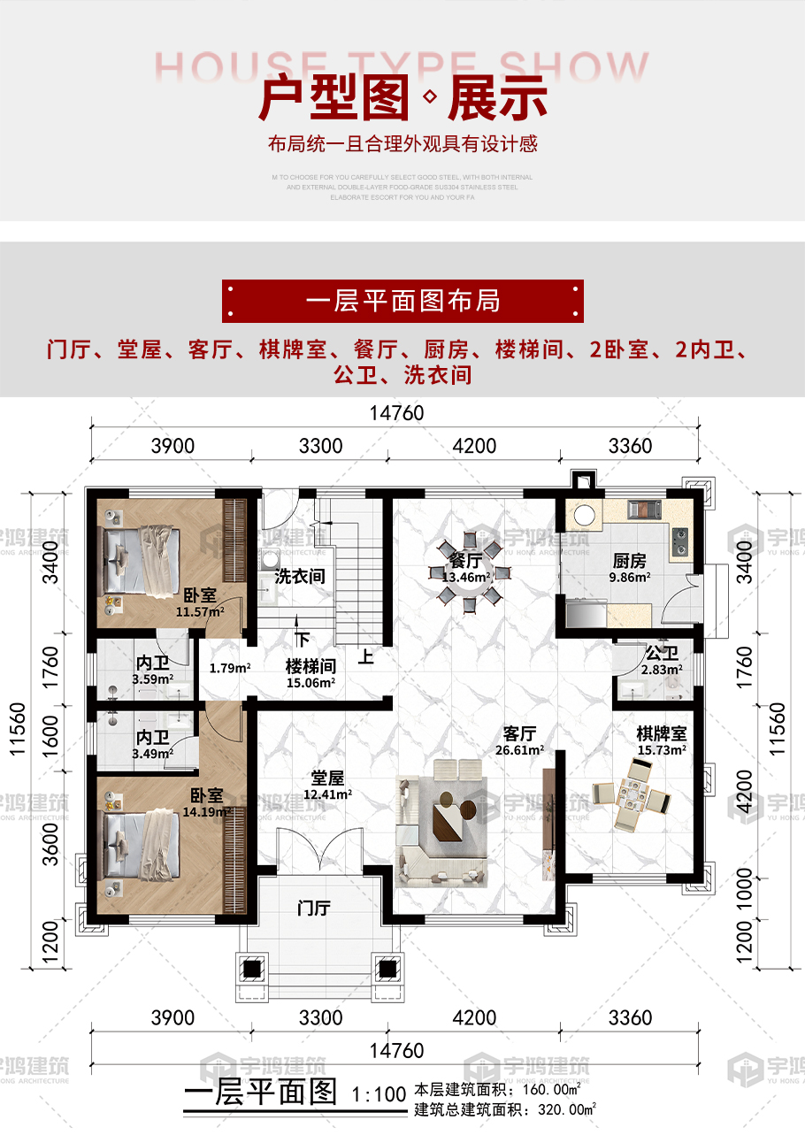 | 開間:14.76米 | 進深:11.56米 | 占地面積:160平方米 | 建筑面積:320平方米 |