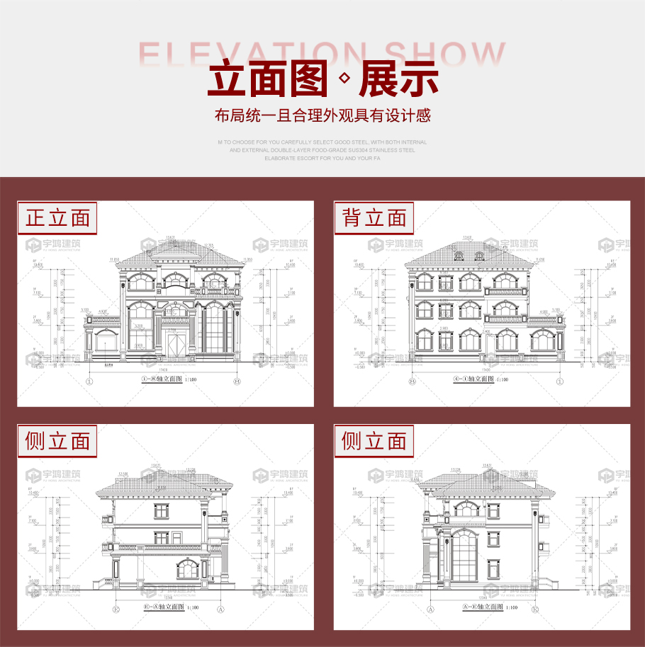 建筑平面圖:一層平面圖,二層平面圖,三層平面圖; 建筑立面圖:東立面圖,西立面圖,南立面圖,北立面圖,剖面圖; 大樣圖:樓梯詳圖,細(xì)部大樣,門窗大樣 |