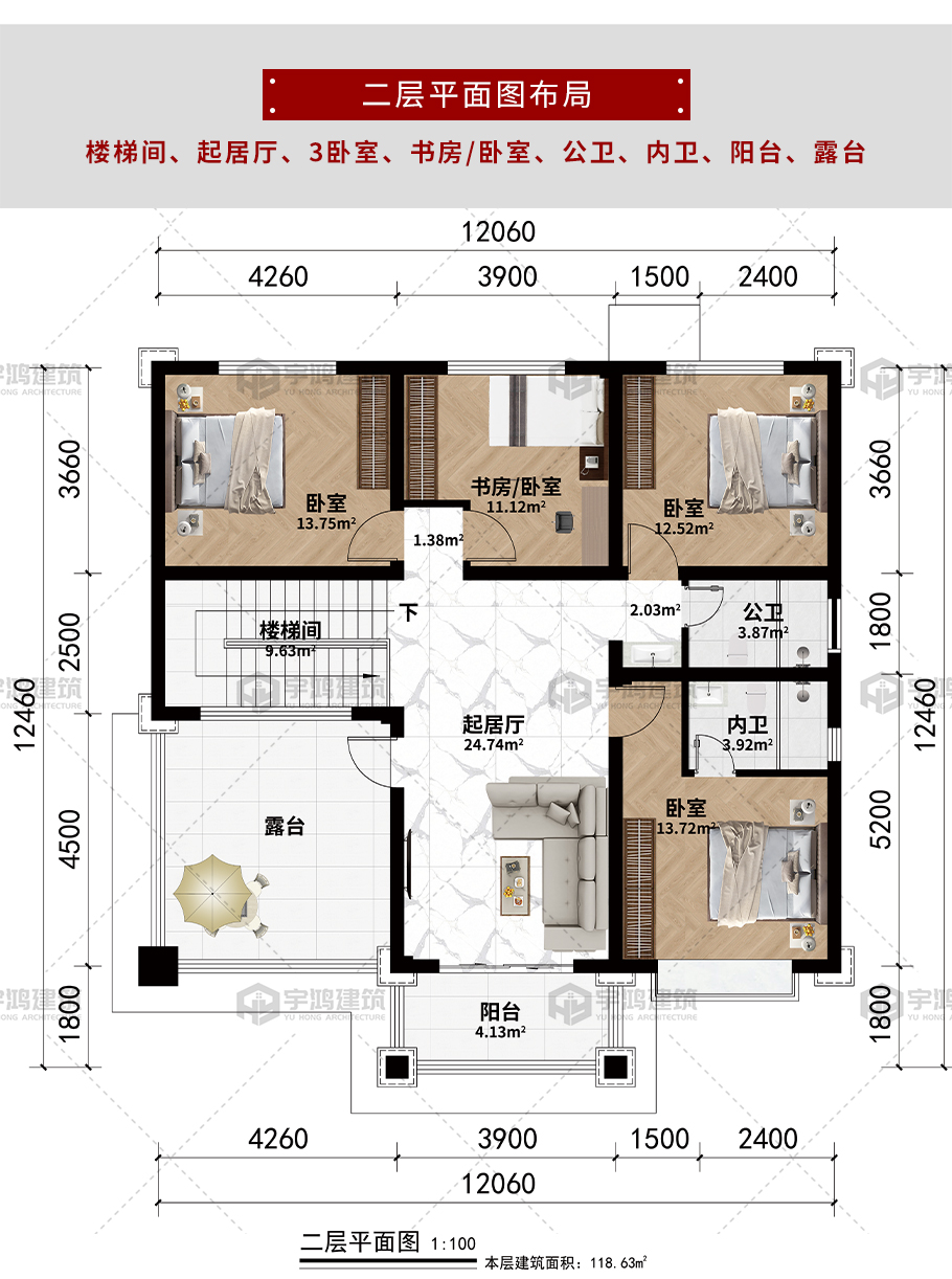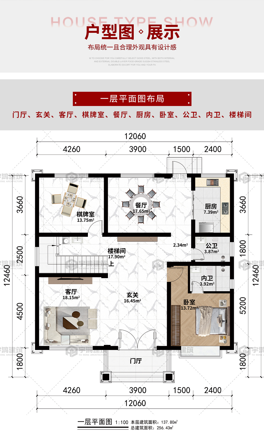 | 開間:12.06米 | 進深:12.46米 | 占地面積:137.8平方米 | 建筑面積:256.43平方米 |