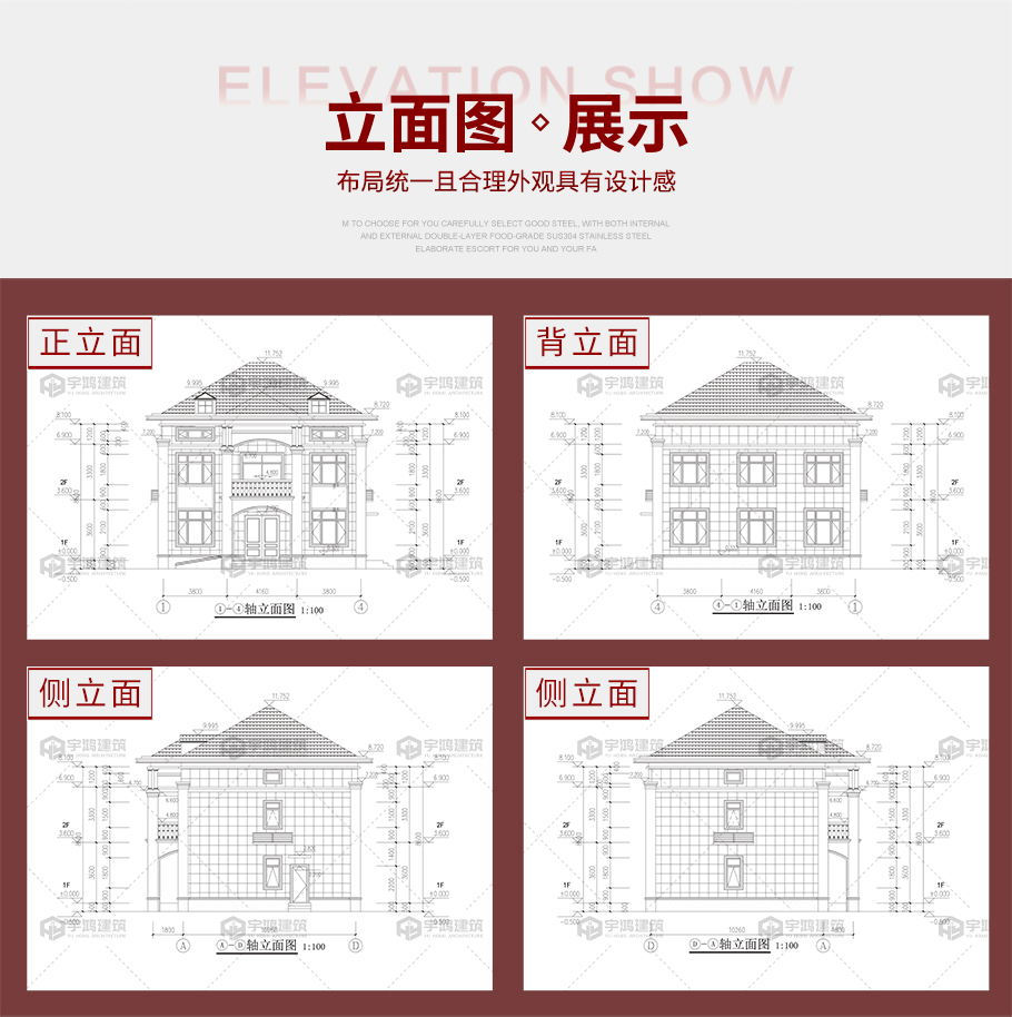 | 建筑圖: | 建筑平面圖:一層平面圖,二層平面圖; 建筑立面圖:東立面圖,西立面圖,南立面圖,北立面圖,剖面圖; 大樣圖:樓梯詳圖,細部大樣,門窗大樣 |